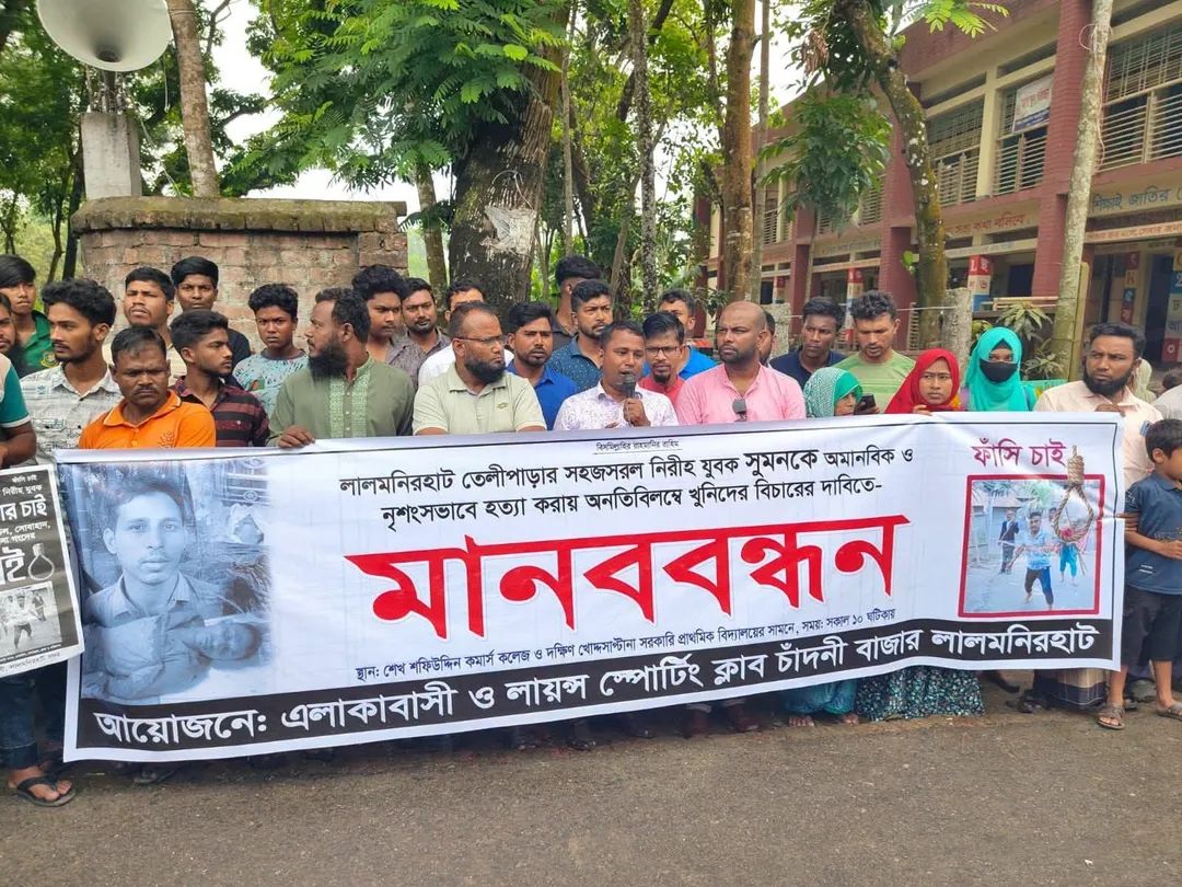 মোঃ একরামুল ইসলাম আশিক,লালমনিরহাট প্রতিনিধি:-লালমনিরহাট সদর উপজেলার তেলীপাড়া এলাকার যুবক সুমনকে নৃশংসভাবে হত্যার প্রতিবাদে উত্তাল হয়ে উঠেছে রাজপথ। খুনিদের দ্রুত গ্রেপ্তার ও দৃষ্টান্তমূলক শাস্তির দাবিতে আজ সোমবার সকালে এক বিশাল মানববন্ধন ও প্রতিবাদ সমাবেশ অনুষ্ঠিত হয়েছে। এলাকাবাসী, বন্ধুমহল ও লায়ন্স স্পোর্টিং ক্লাবের উদ্যোগে সকাল ১০টায় লালমনিরহাট শহরের শেখ শফিউদ্দিন কমার্স কলেজ ও দক্ষিণ খোদ্দসাপটানা সরকারি প্রাথমিক বিদ্যালয়ের সামনের সড়কে এই কর্মসূচি পালন করা হয়।এতে নিহতের স্বজনসহ এলাকার কয়েকশ মানুষ অংশগ্রহণ করেন। এ সময় ব্যানার ও ফেস্টুন হাতে অংশগ্রহণকারীরা ‘সুমন হত্যার বিচার চাই’ এবং ‘খুনিদের ফাঁসি চাই’ স্লোগান দেন।