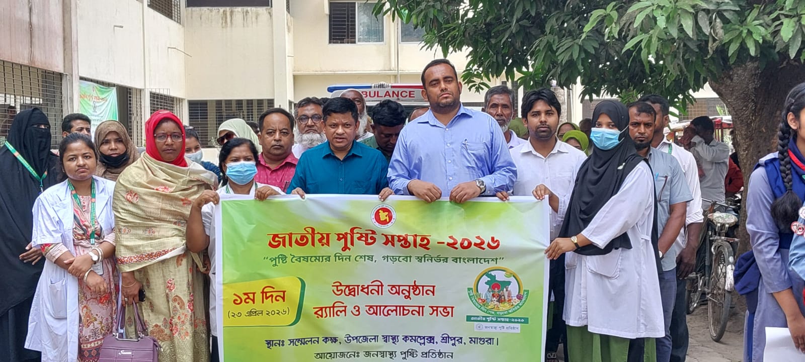 ‘পুষ্টি বৈষম্যের দিন শেষ, গড়বো স্বনির্ভর বাংলাদেশ’—এই প্রতিপাদ্যকে সামনে রেখে মাগুরার শ্রীপুর উপজেলায় সাত দিনব্যাপী জাতীয় পুষ্টি সপ্তাহ শুরু হয়েছে। এ উপলক্ষে বৃহস্পতিবার (২৩ এপ্রিল) সকালে উপজেলা স্বাস্থ্য কমপ্লেক্সের উদ্যোগে বর্ণাঢ্য র্যালি ও আলোচনা সভা অনুষ্ঠিত হয়।